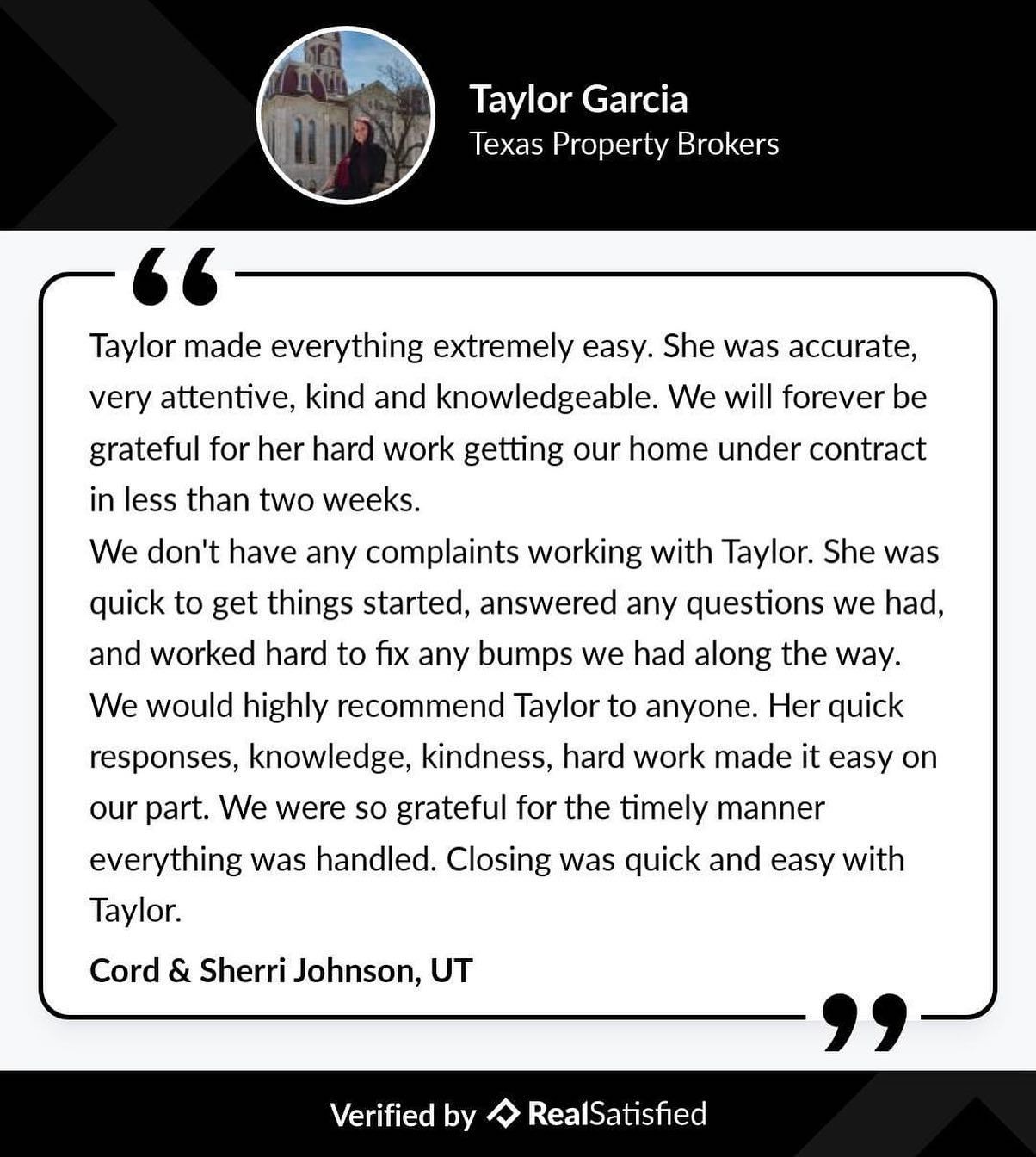 Taylor went above and beyond the moment I contacted her and even after the deal was done! Not only is she an amazing realtor, but she's an awesome person to work with and will be a life long friend to my family and I! I can't thank her enough for fighting for our forever home!